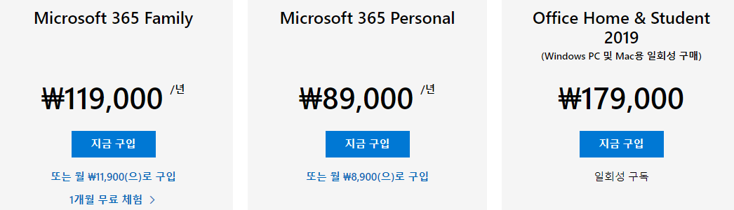 이에 반해 2019 버전은 온라인 버전이 아니라서 한번 설치하면 평생 쓸 수 있고, 가격도 한 번만 내면 됩니다.