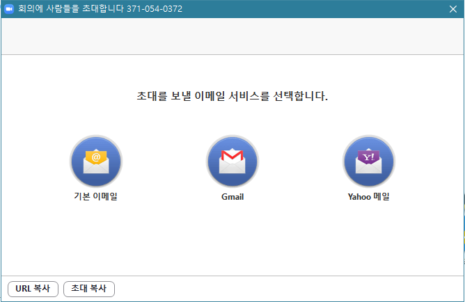 초대를 보낼 이메일 서비스를 선택해서 메일을 보내거나 단순하게 맨 아래 URL 복사를 누르고 카톡이나 메신저로 붙이기 하면 회의실에 입장할 수 있는 URL을 보내주게 됩니다.