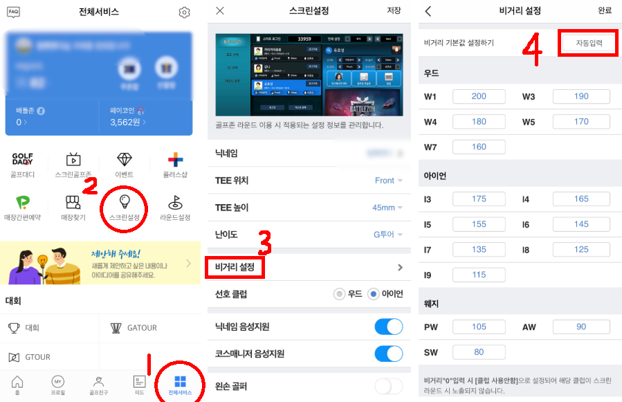 골프존 앱에서 나의 비거리 설정 하는 방법
