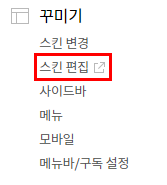 관리자 메뉴 - 꾸미기 - 스킨 편집을 클릭합니다.