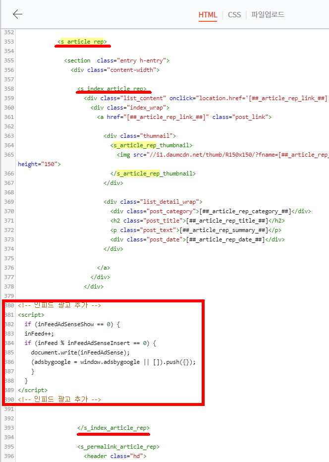 아까 애드센스에서 생성한 인피드 광고의 코드를 사용하면 됩니다.