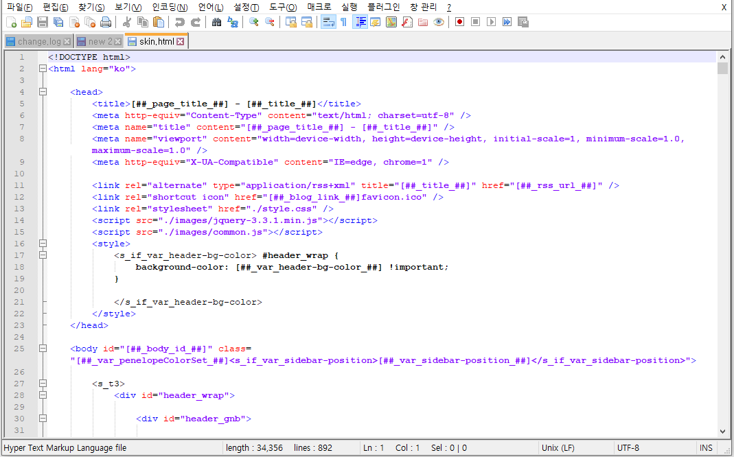 수정한 내용을 미리 받아둔 고래스킨의 HTML 파일에 반영을 해두고 업로드를 하거나