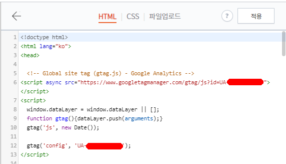 이 코드를 </head> 안쪽에 위치한 아래의 위치에 넣습니다.