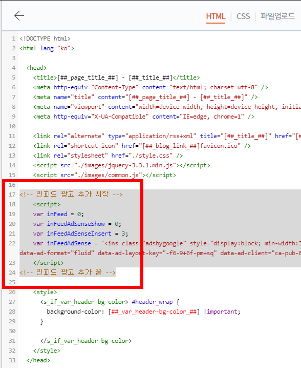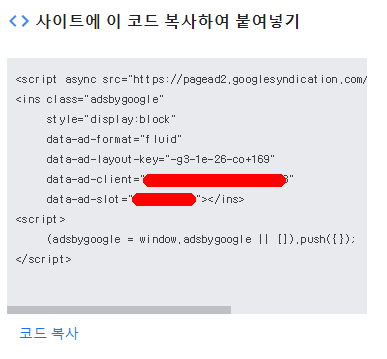 아까 애드센스에서 생성한 인피드 광고의 코드를 사용하면 됩니다.