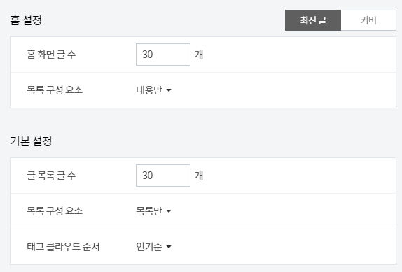 기존 스킨을 사용하면서 별도로 설정 했던 것을 기억해 두었다가 설치 후에 다시 설정해야 합니다.
