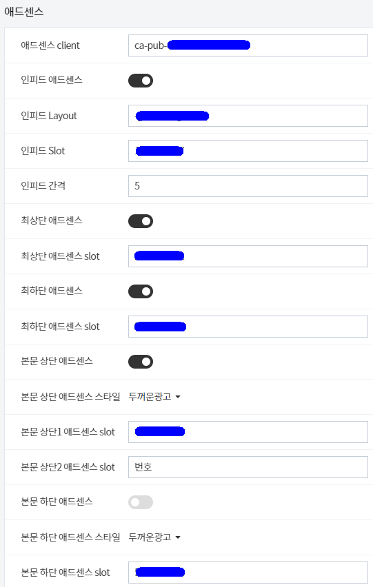 애드센스 승인 시 필요한 코드는 스크립트 형태이므로 이건 반드시 스킨 변경 이후에 수동으로 넣어줘야 합니다.