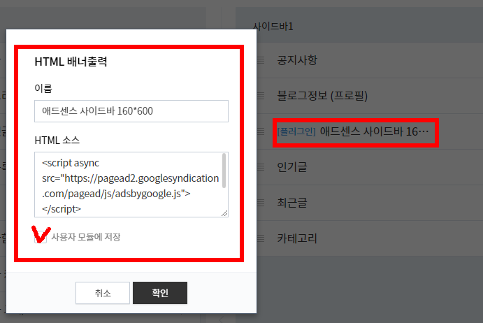 사이드바 HTML 광고 <- 사용자 모듈로 저장해 두어 이미 적용