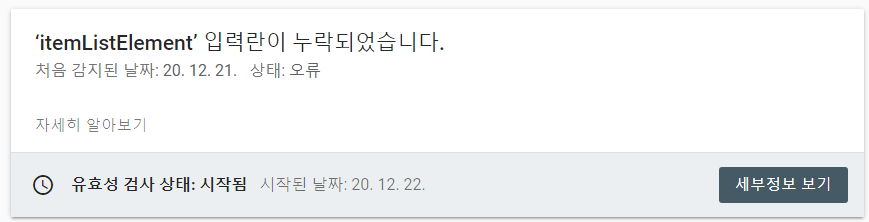 itemListElement 입력란이 누락되었습니다. 라는 오류는 카테고리를 생성하고 해당 카테고리에 글이 없을 때 발생하는 현상입니다. 티스토리에 최근 카테고리를 생성했는데 글이 0인 시점이 있었는데 아마 그 때 발생한 것으로 보입니다.