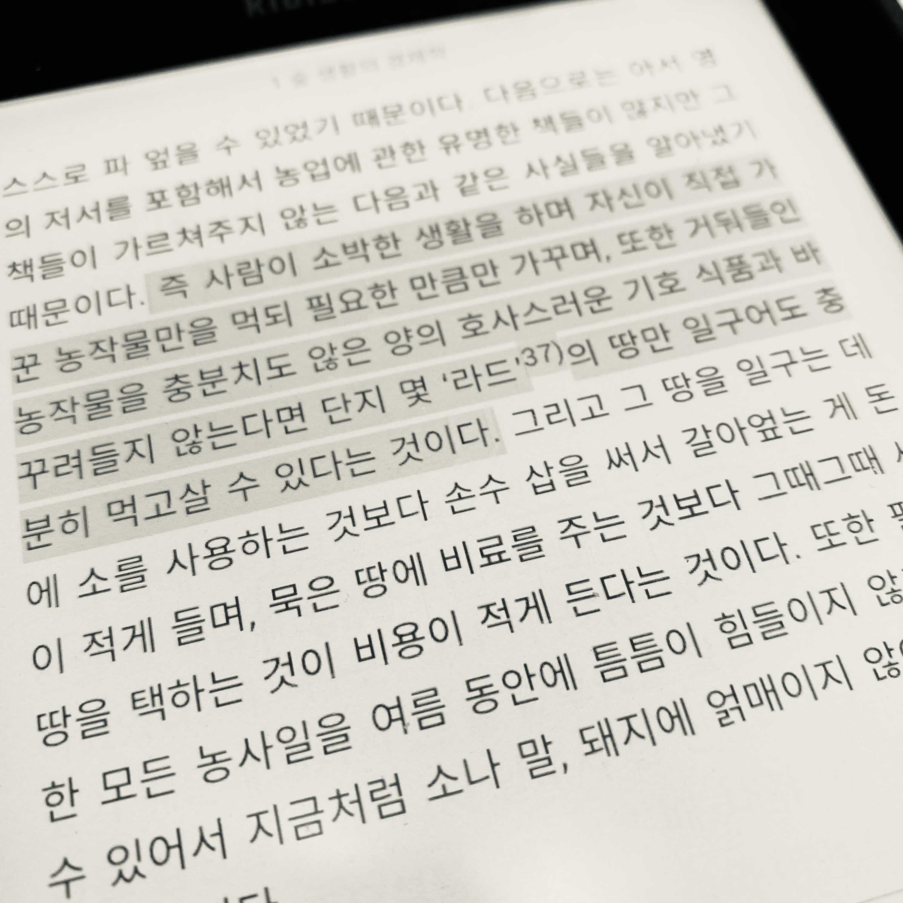 이번에 읽은 부분은 건축에 관한 내용이었으며 서로우의 건축가에 대한 생각, 유명한 건축물에 대한 생각에 공감하는 시간이었습니다. 집을 짓고 대부분을 자급자족하며 책을 읽고 글을 쓰는 생활을 하는 서로우에 대해 더 알고 싶어지네요.