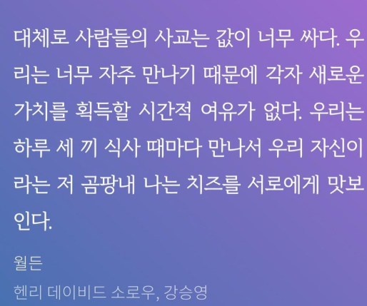 사람을 만나는 사교는 값이 너무 싸서 너무 자주 만나서 서로 치고받는 싸움판이 벌어진다는 말 공감이 되나요? 코로나로 잘 못만나는 상황에서도 서로 치고 받는 싸움들을 많이 보고 있는 실정입니다.