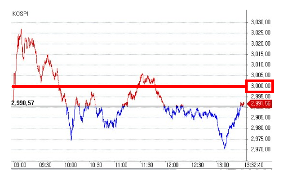 오늘 오전 주식시장이 개장하자마자 3,000 포인트를 넘어섰습니다.