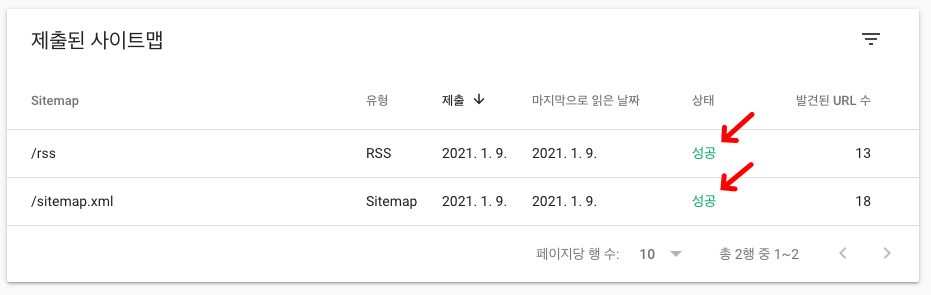 그럼 아래와 같이 sitemap.xml 파일과 rss 모두 등록된 것을 확인할 수 있습니다.