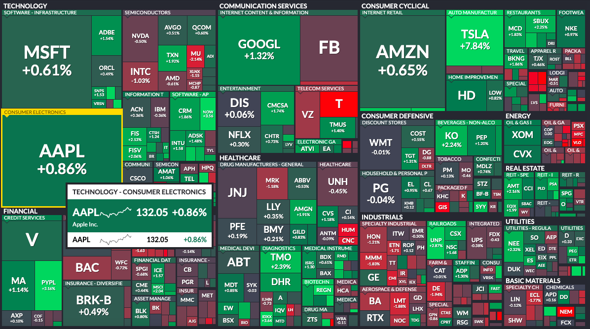 지난 금요일 장마무리 현황입니다. 미국 주식 S&P 500에 포함된 주식을 시가총액 기준으로 사각형의 면적으로 표현한 그림입니다.
