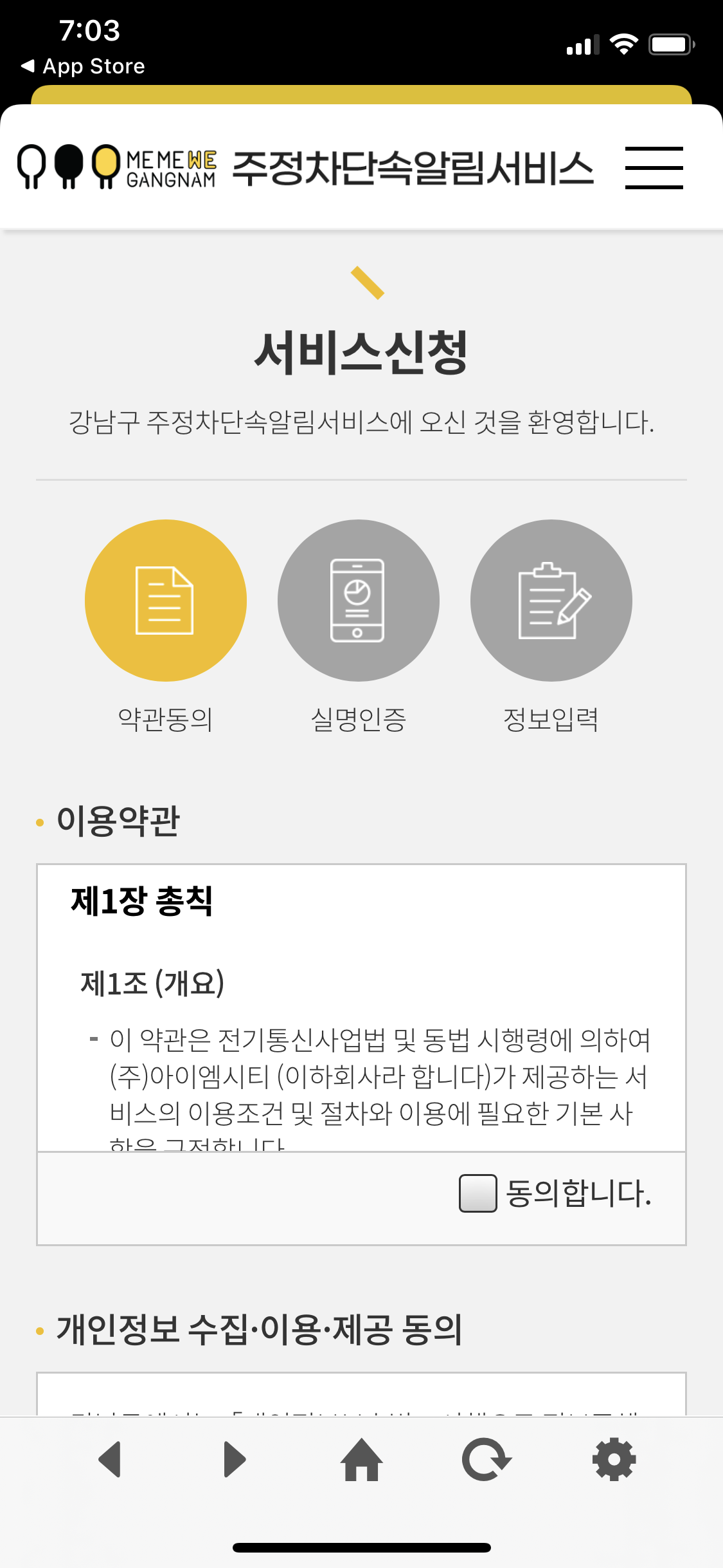 드디어 나옵니다. 개인정보 동의. 위탁동의까지 하고, 진행합니다. 다행히 우리 동네는 회원 가입하라고 하지는 않아서 다행입니다.