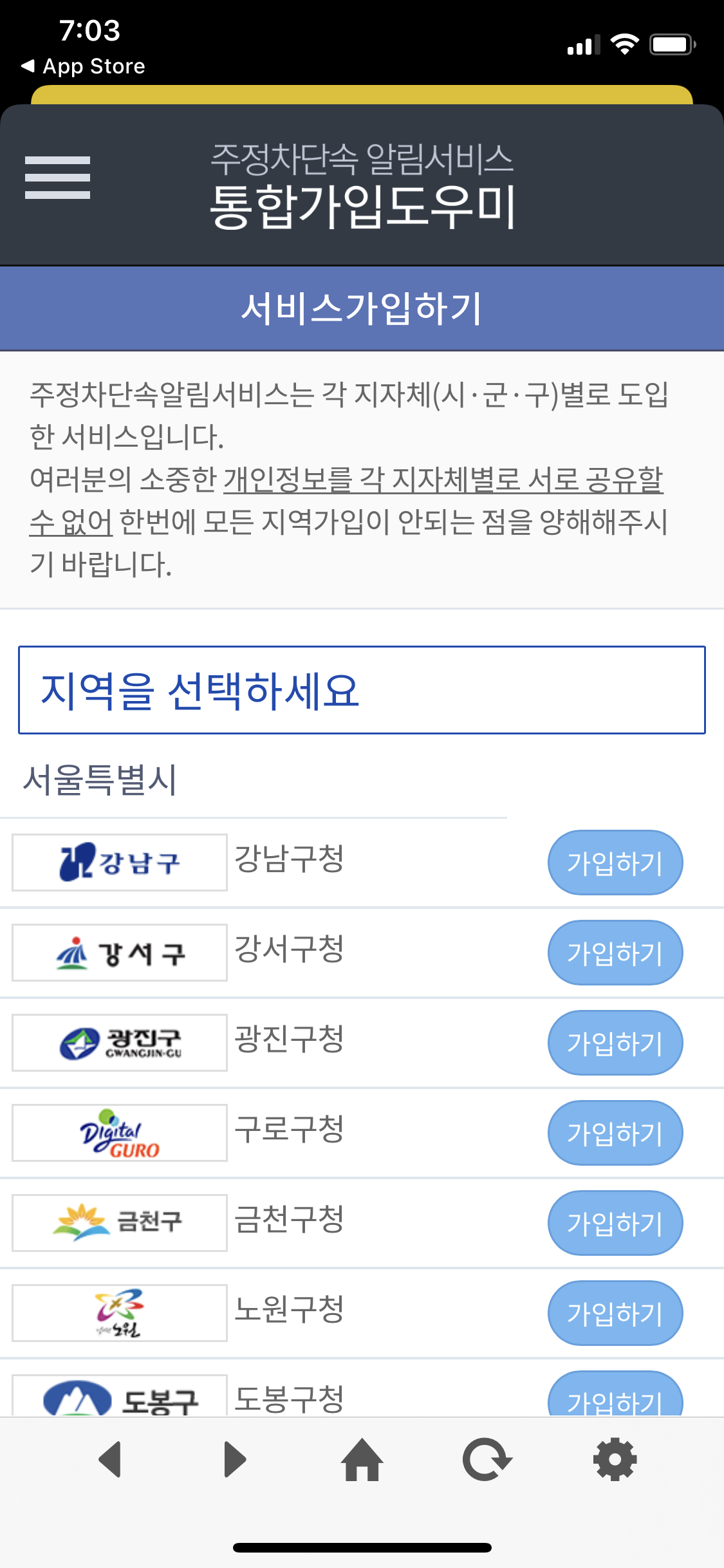 한번 앱을 설치해서 제가 살고 있는 지역만 등록해보고 다른 지역 등록 하려다가 말았습니다. 언제 혹시가 갈지 안 갈지 모르는 곳에서 주정차 단속 한번 걸릴지도 모른다는 미미한 확률을 대비하기 위해 하기에는 개인정보제공 동의나 제3자 제공동의, 게다가 일부 구청은 회원가입까지 해야 하는 상황이라 사는 동네 하나만 했습니다.
