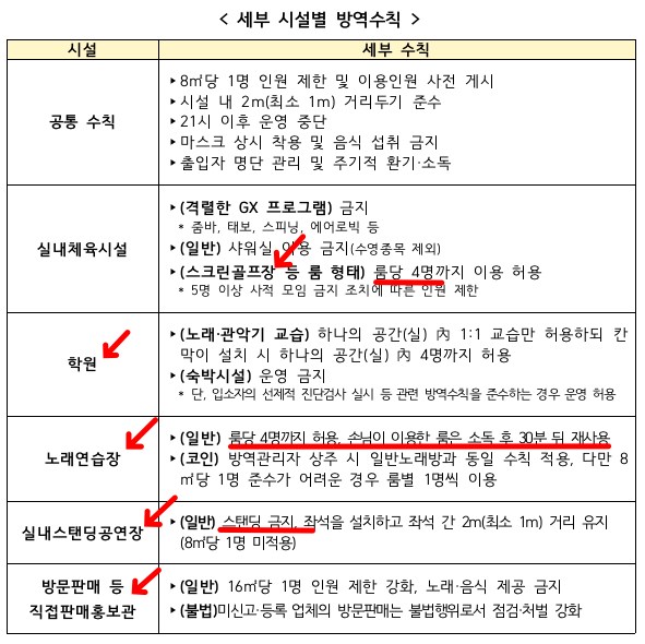 이번에 스크린연습장, 노래방, 실내 스탠딩 공연장, 방문판매까지 허용되네요. 특이한 점은 노래방의 경우에는 소독을 한 후에도 30분 뒤 재사용이 가능한 점과 실내 스탠딩 공연장은 스탠딩은 금지되고 좌석만 활용한다는 점이네요.