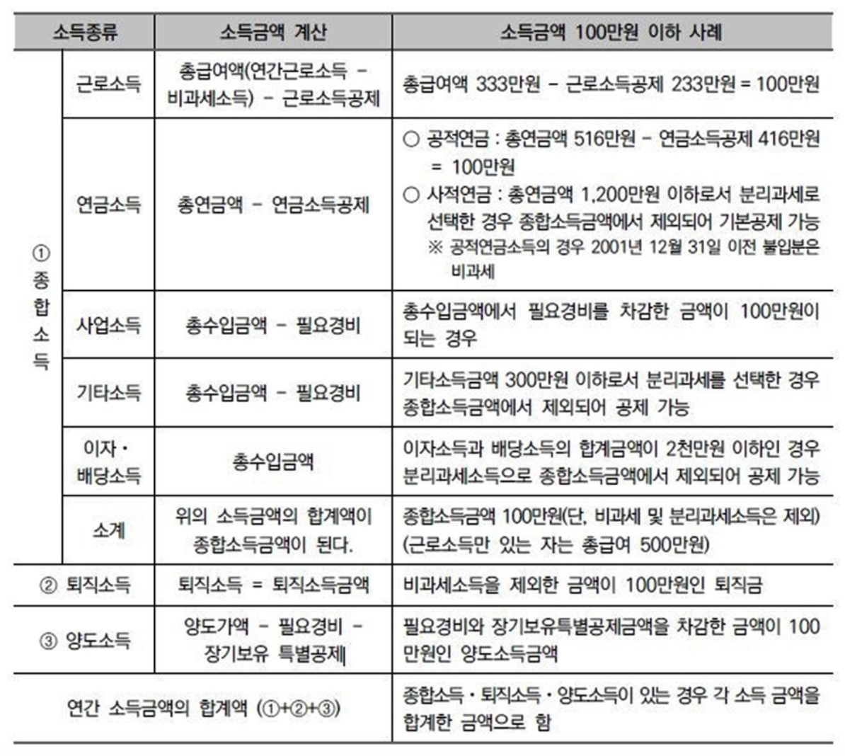 근로자의 부양가족이 인적공제(기본공제) 대상자가 되려면 연간 '소득금액' 합계액이 100만 원 이하여야 합니다.