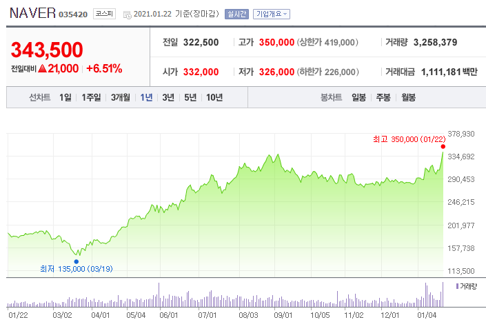 네이버의 오늘 종가를 기준으로 보면 장중에 전고점을 돌파한 것으로 나옵니다. 거래량도 터지는 모습을 보이고 있습니다. 당장 다음주 월요일 주가를 예측하기 어렵듯이 주가의 등락은 언제든지 있을 수 있다는 것은 고려하되 장기적으로 비전이 있는지에 대한 개인적인 신념에 따라 투자여부를 결정하면 될 것 같습니다.