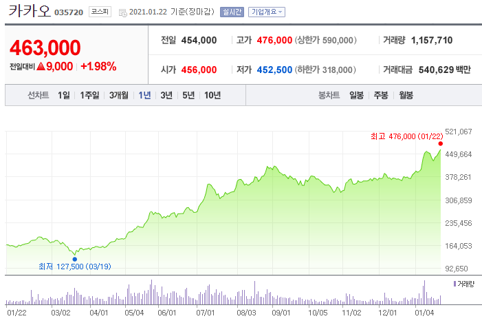 카카오는 종가기준으로 전고점을 돌파했습니다. 52주 최고가 463,000원을 기록했습니다. 역시 회사의 앞으로의 비전을 보고 투자 여부를 정해야 하겠습니다.
