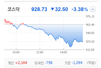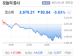 카카오의 마이데이터 이슈를 살펴봤는데 오늘은 전반적으로 주식시장이 조정을 받는 분위기입니다. 종합주가지수가 3% 이상 빠지는 시장이었네요. 외국인과 기관은 모두 팔았는데 개인은 계속 매수하는 분위기네요.