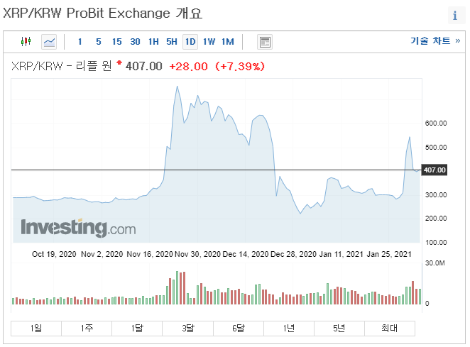 그런데 2020년 11월 800원대까지 올라갔다가 12월에 급하락 하고 1월에 500원대까지 올랐습니다. 그러던 중 2월 1일 800원대에 다시 오르고 2일에 다시 300원대로 복귀했습니다. 정말 급등락이라고 볼 수 있습니다. 암호화폐는 이렇게 급등락 때문에 섣불리 투자하기가 참 어렵습니다.