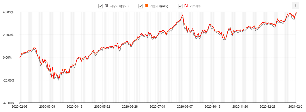 1년간의 시장가격이 기초지수를 충실하게 따라가고 있는 것을 볼 수 있습니다.