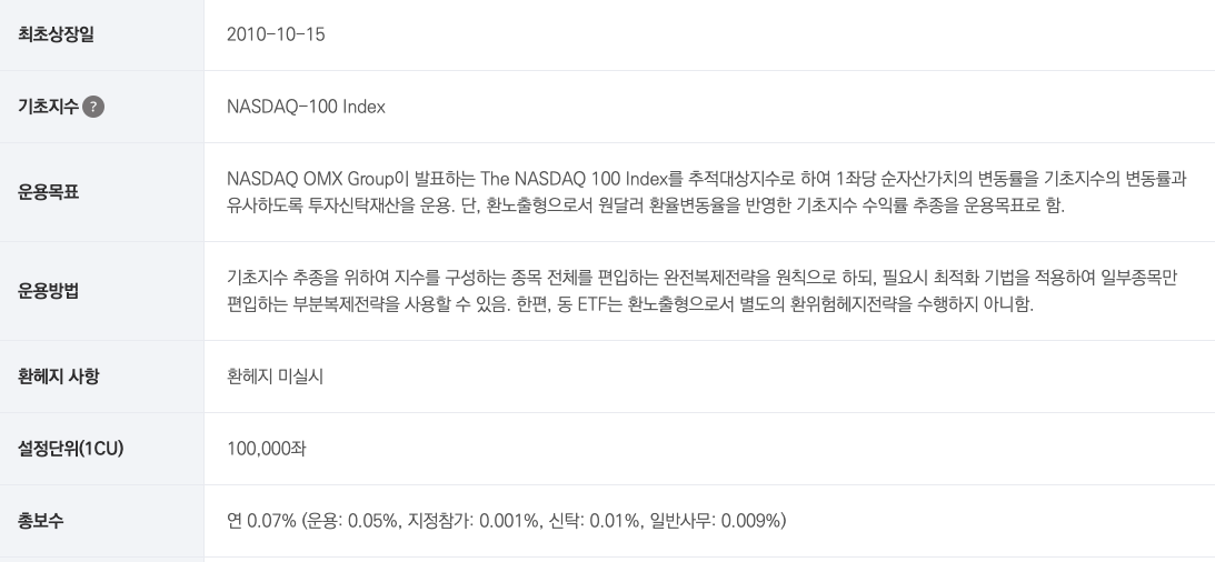 게다가 기존에 수수료가 0.49%였는데 지금은 0.07%로 낮아졌습니다. 0.49%는 나스닥100 지수를 그대로 추종하는 인덱스 성격의 펀드임에도 불구하고 지나치게 높은 수수료 였었지요. 이에 대해서 불만의 목소리도 많았었는지 0.07%로 수수료를 대폭 낮추었습니다.