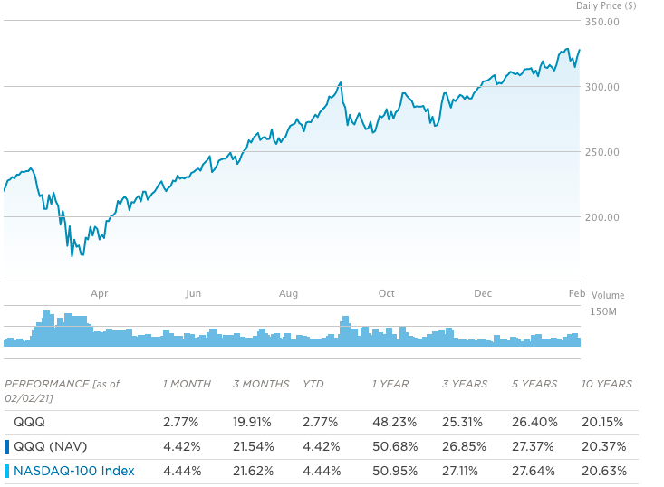 최근 1년간의 가격변동을 살펴보면 아래와 같습니다. 실제 나스닥 100과 비교해볼때 나스닥 100의 수익률을 그대로 추종하고 있는 것을 알 수 있습니다.