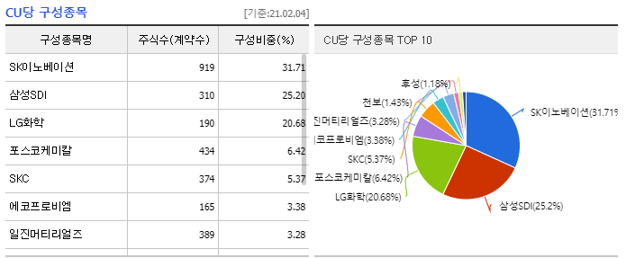 이 ETF는 국내 주식을 주된 투자대상 자산으로 하며, “KRX 2차전지 K-뉴딜 지수”를 기초지수로 하여 만들어진 것으로 “KRX 2차전지 K-뉴딜 지수”는 한국거래소에서 발표하는 지수로서, 유가증권시장 및 코스닥시장 상장종목 중 2차 전지(Secondary Batterry) 산업군 내 대표기업 10 종목을 구성종목으로 하는 지수입니다.