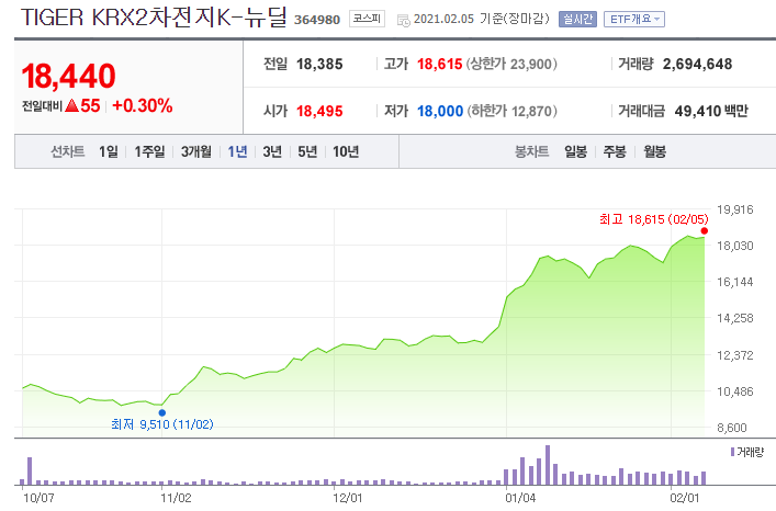 이에따라 국내에서 투자할 수 있는 배터리 관련 ETF는 TIGER KRX2차전지K-뉴딜이 있습니다. 작년에 10월에 만들어진 ETF로 현재까지 많은 성장을 했습니다.