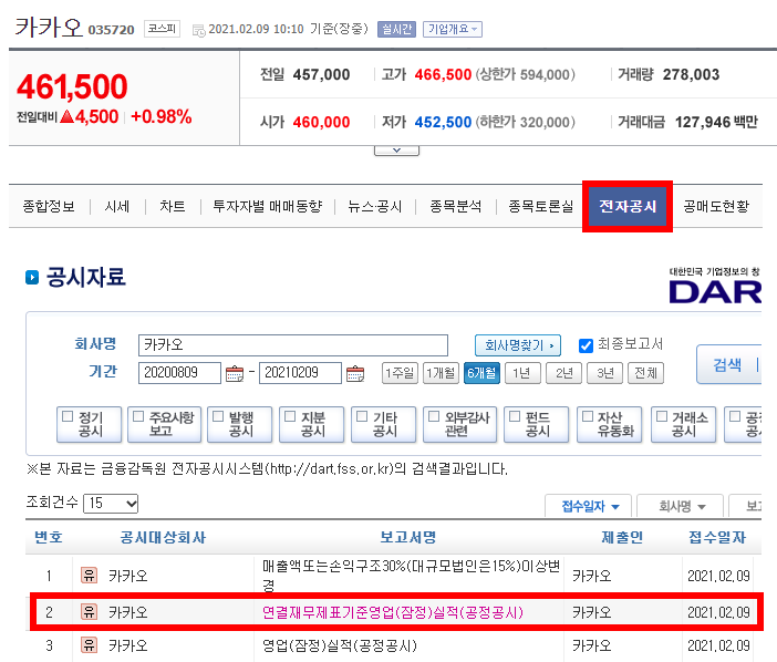 카카오는 지난해 4분기 연결기준 영업이익이 1498억4300만원으로 전년 동기 대비 88.3% 증가했으며 같은 기간 매출액은 1조 2350억 6100만 원으로 45.7% 늘어난 것으로 공시했습니다. 공시된 내용을 조회하는 방법은 아래와 같이 두 가지 방법이 있습니다. 둘 중에 네이버 금융에서 조회하는 것이 편하기는 하지만 전자공시시스템에서 조회하는 방법도 알아두는 것이 좋습니다.