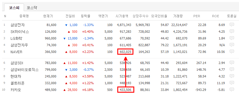 카카오와 네이버는 현재 KOSPI 10위안에 랭크된 종목들입니다. 카카오는 10위, 네이버는 5위에 위치하고 있습니다.