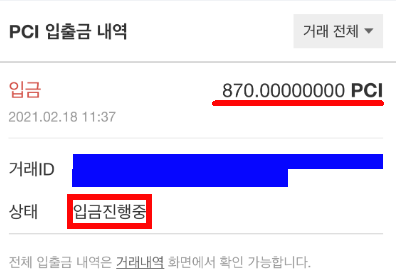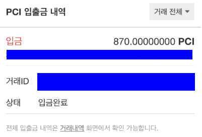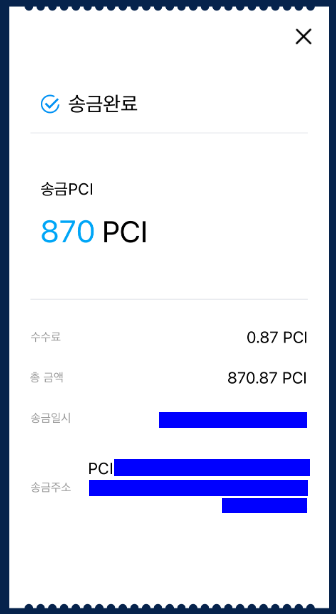 결과적으로 870PCI 를 전송하면 0.87 PCI는 수수료로 납부가 됩니다.