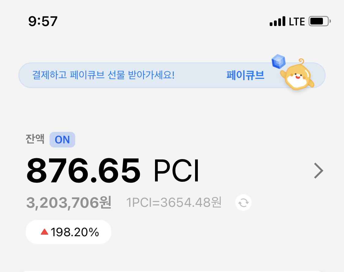 현재 1PCI = 3654.48원으로 총가치는 320만 원가량 됩니다.