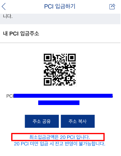 그러면 아래와 같이 PCI 입금하기가 나오고 내 페이코인 입금주소가 나옵니다.