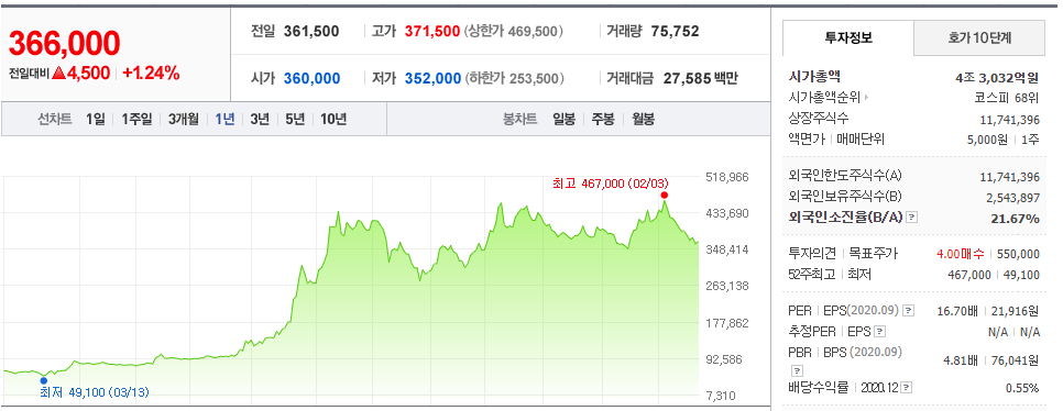 참고로 모회사인 SK케미칼의 경우 2월 23일 기준 시가총액 4조 3000억 정도의 수준입니다.