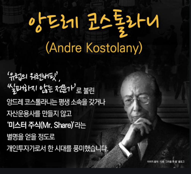 - 앙드레 코스톨라니는 삼성전자와 같은 우량주 사놓고 그냥 쳐다보지 말고 있으라고 합니다.