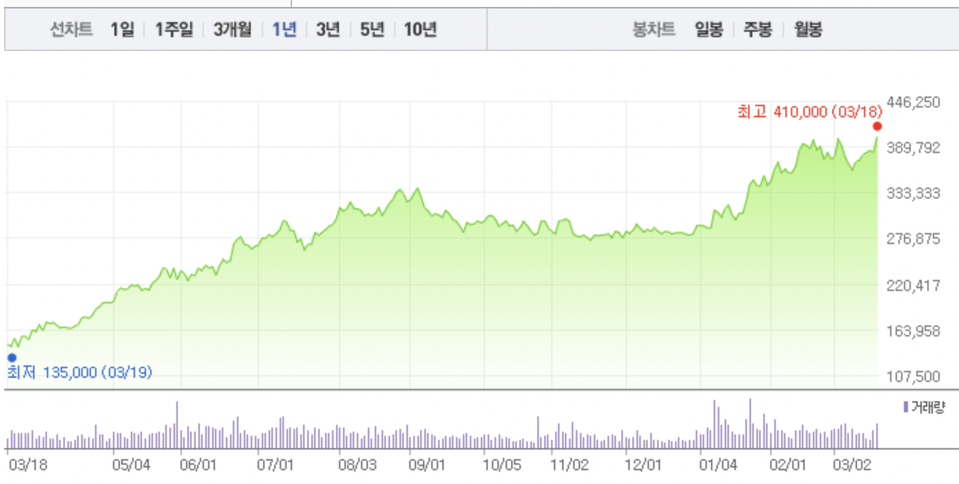 카카오의 경우 519,000원을 지난 2월에 찍고 하락하다가 다시 전고점을 깨려 도전하고 있습니다. 네이버의 경우 오늘 장중에 전고점을 잠깐 뚫어 410,000원을 찍었네요. 둘 다 좋은 흐름입니다.