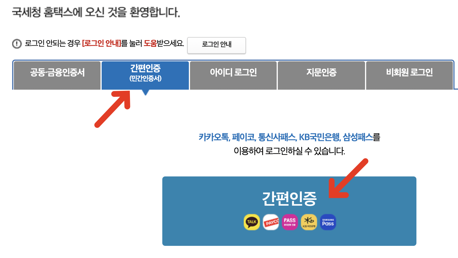 카카오나 PASS와 같은 인증서로 로그인이 가능합니다.