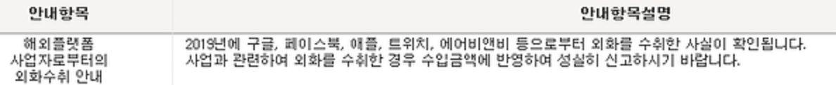 여기에 아래와 같이 해외 플랫폼 사업자로부터의 외화 수취 안내가 나오면 종합소득을 신고해야 합니다.