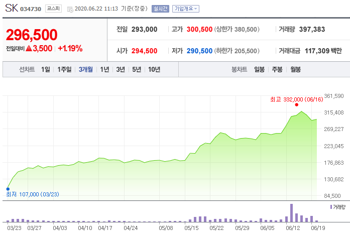 모기업인 SK의 주가도 이런 기대감에 많이 올랐습니다. SK바이오팜을 100% 소유한 회사이기 때문입니다.