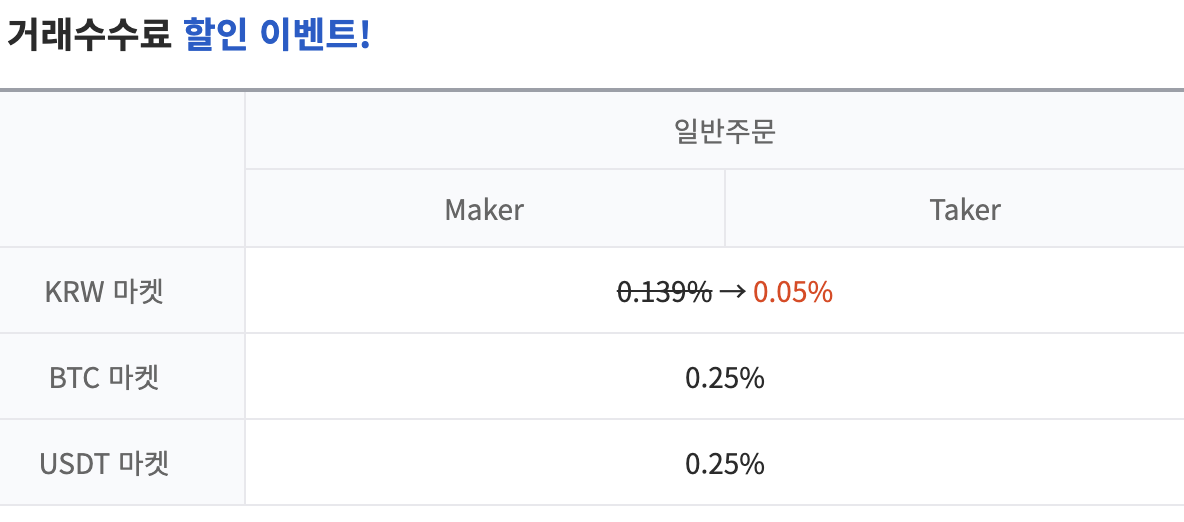빗썸과 업비트의 경우 메이커 / 테이커 모두 동일한 수수료를 받습니다.