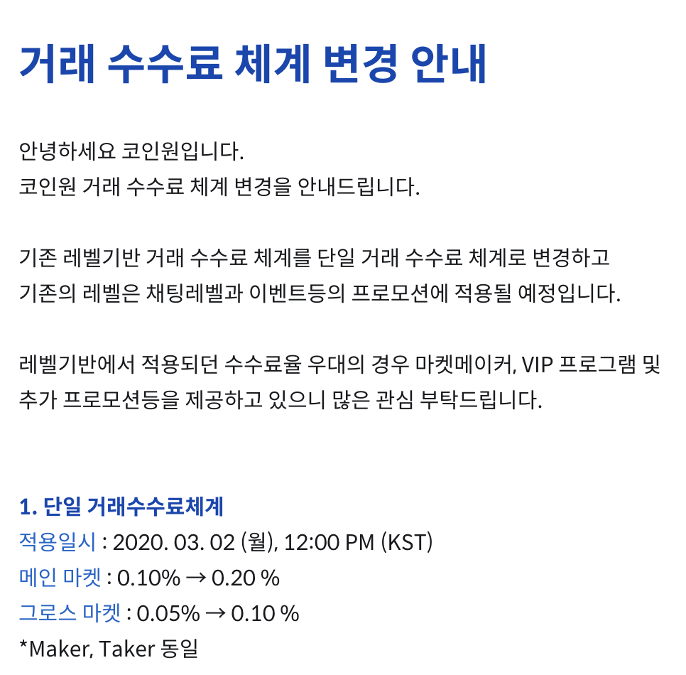 코인원의 경우 메이커와 테이커 주문 시 수수료가 서로 달랐었는데 지금 보니 동일하게 바뀌었네요.
