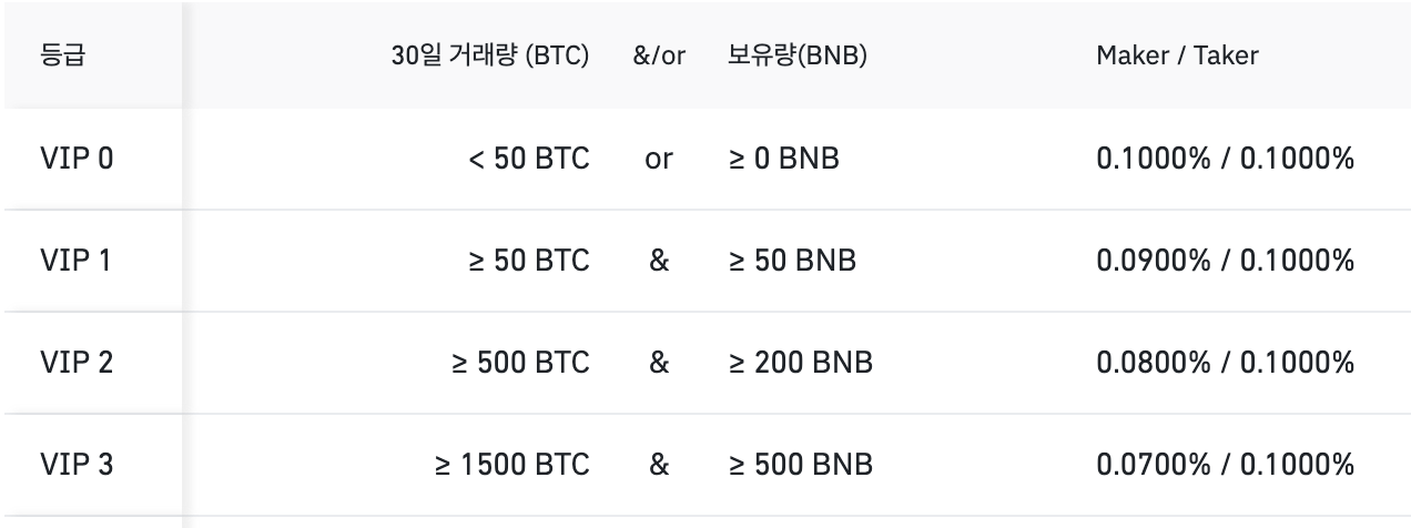 바이낸스의 경우 위와 같이 VIP 등급에 따른 수수료 체계를 가지고 있습니다.