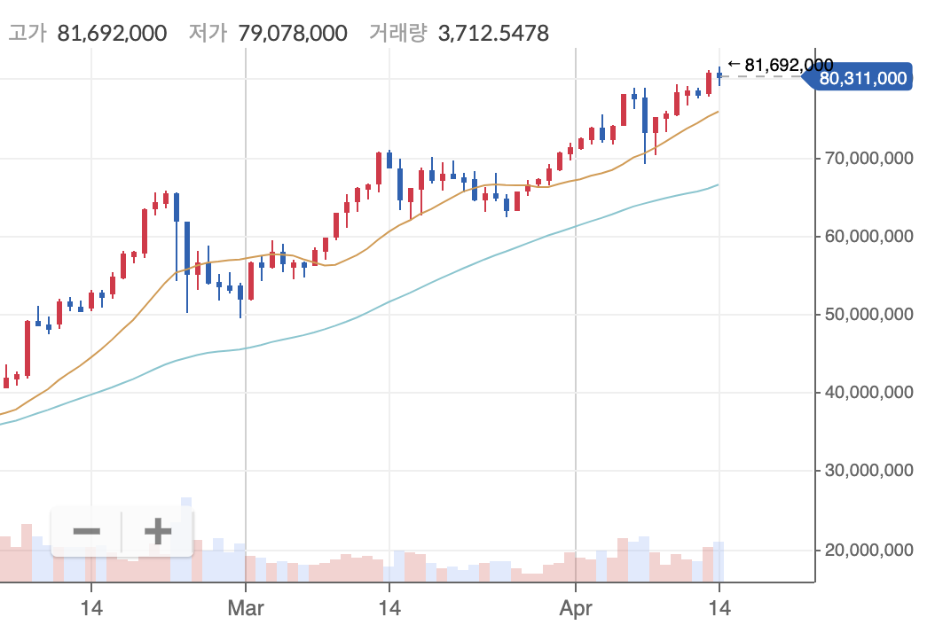 현재 환율이 1116원을 적용할 경우 6만2천달러는 7천만 원 조금 안됩니다. 그런데 우리나라 가격이 8천만 원 선이라고 하니 약 14% 비싼 가격으로 거래가 되고 있는 것을 알 수 있습니다. 14%가 바로 김치 프리미엄입니다.