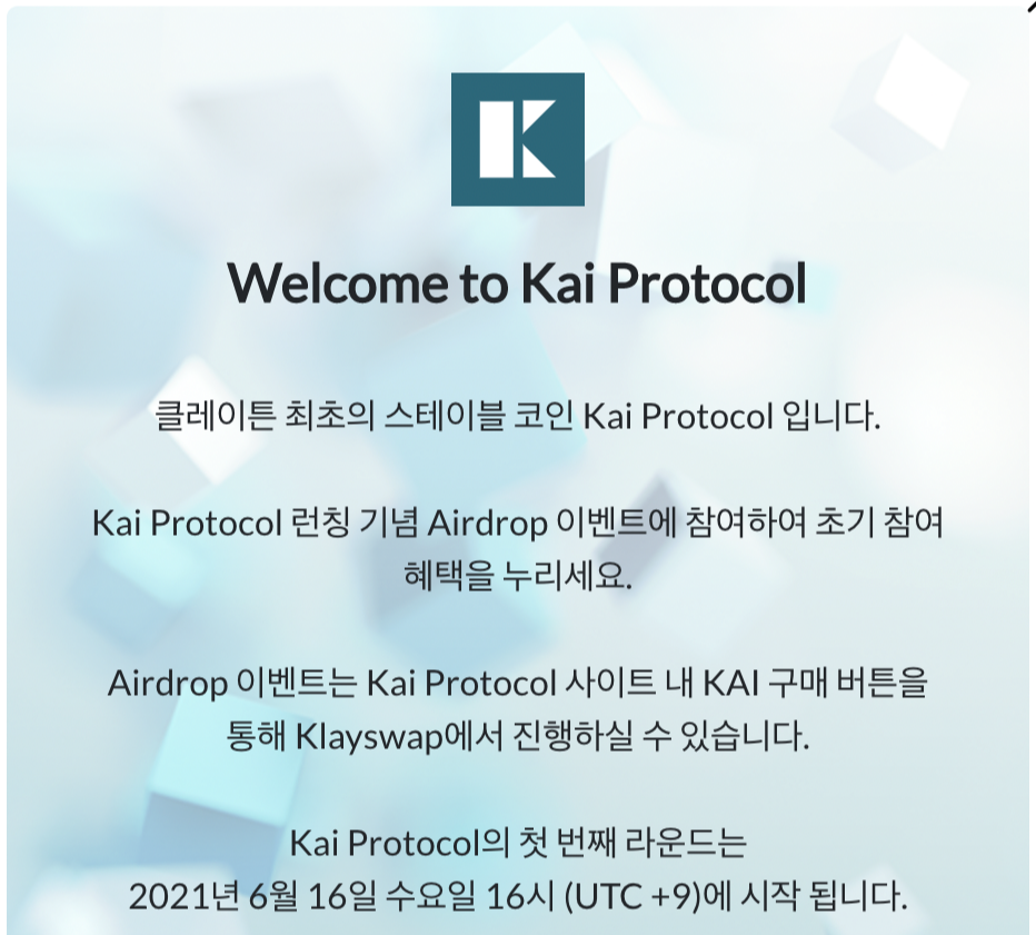 우선 금일 Kai Protocol 웹사이트 공개가 클레이스왑풀 생성 보다 늦게 되면서 혼선을 드려 죄송합니다. 그 동안 Kai Protocol팀이 주로 프로젝트를 진행해 온 ETH, BSC 환경이 아닌 팀에게는 조금은 생소한 Klaytn 환경에서 개발을 진행하다 보니 최종 테스트를 진행하면서 몇 가지 이슈가 발생하여 웹사이트가 라이브 시점이 미루어졌습니다.