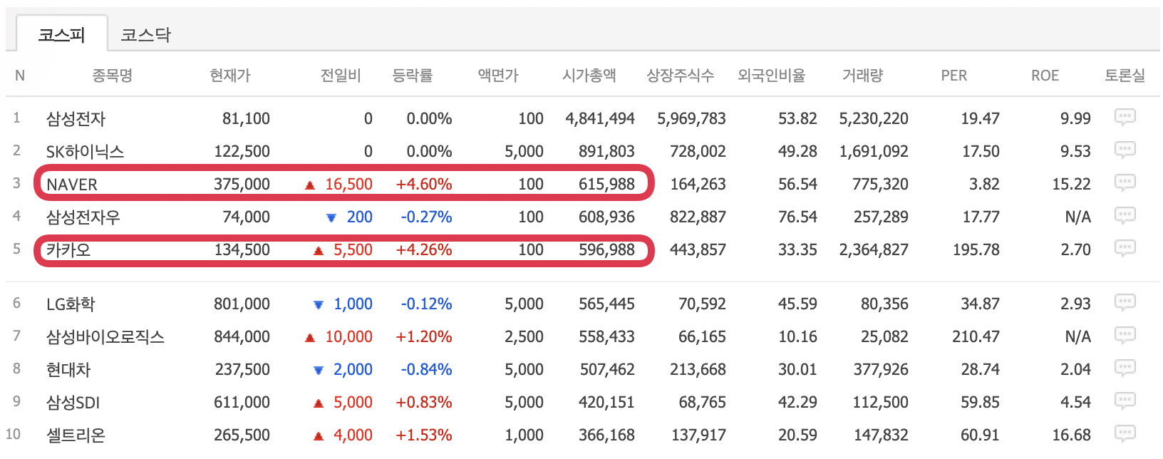 네이버 시총 3위, 카카오 시총 5위 | 누가 먼저 2위를 탈환할 것인가?