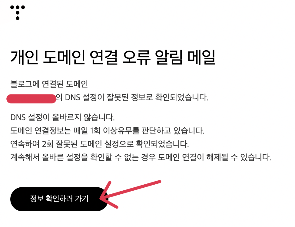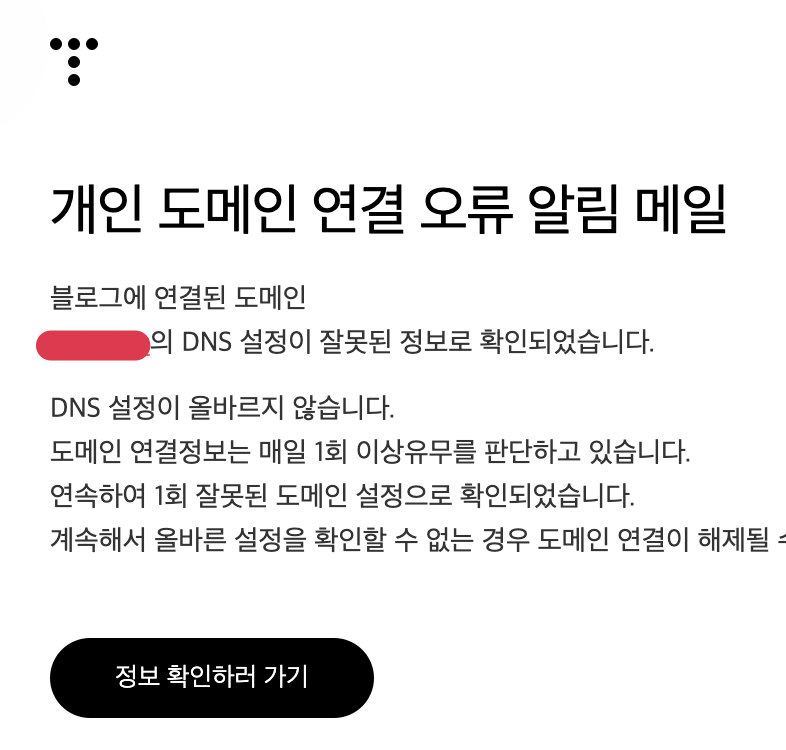 결국 무슨 이유가 되었든지 티스토리에서 DNS설정 정보를 주기적으로 확인하는 과정에서 오류가 나면 사용자에게 메일이 오는 것 같습니다. 사용자는 들어가서 다시 DNS 설정 정보를 확인하는 버튼을 클릭해주어야 하는 거고요.