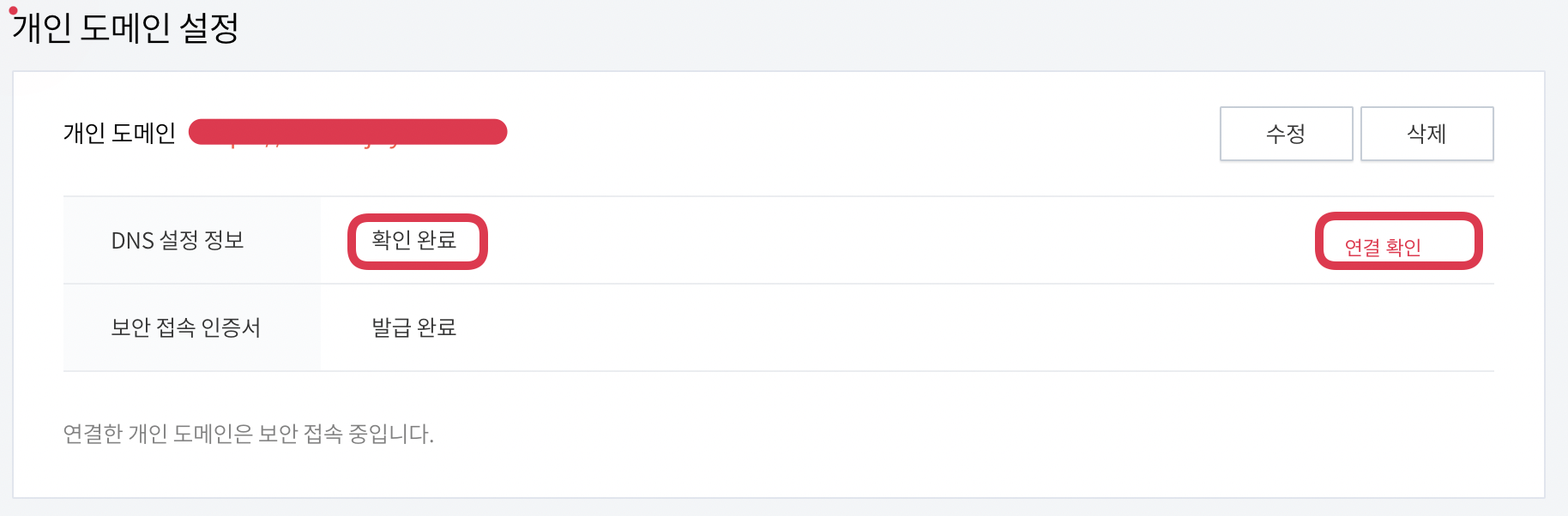 그리고 아래 개인도메인 설정 메뉴로 가서 DNS 설정 정보가 <확인 완료>가 아닌 경우에 우측 끝에 다시 확인 버튼을 클릭하면 <확인 완료>로 바뀌면서 정상 동작하게 됩니다.