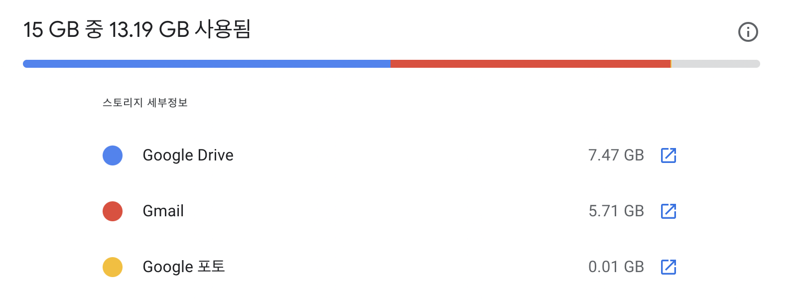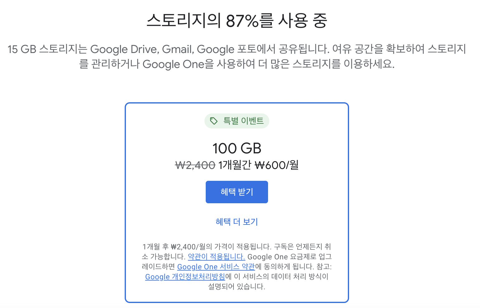 여기서 주의해야 할 점은 구글 드라이브와 지메일 그리고 포토 까지 모두 합해서 15기가까지만 무료라는 점입니다.